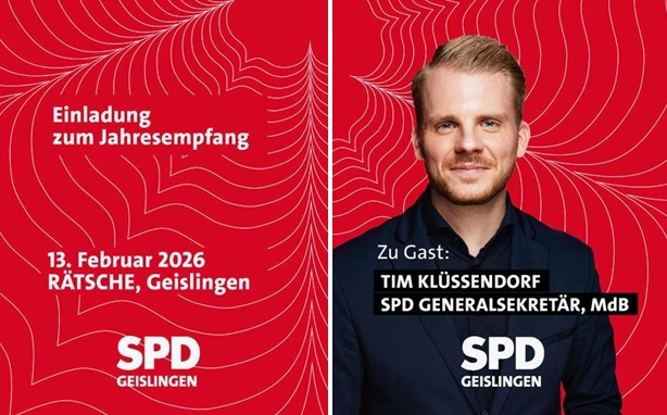 Freitag, 13.02.2026, 18.00 Uhr, Rätsche Geislingen, Neujahrsempfang SPD Geislingen mit dem Generalsekretär der SPD Bund Tim Klüssendorf (MdB)